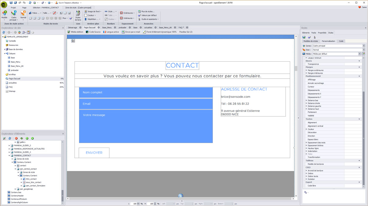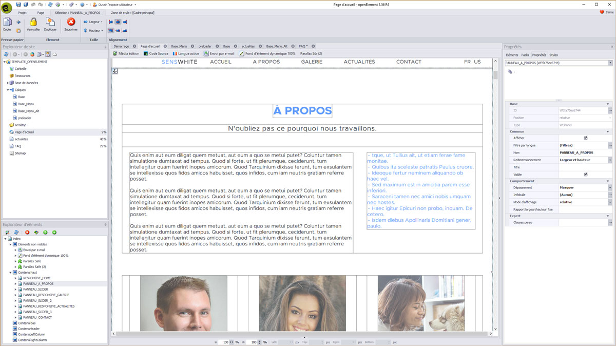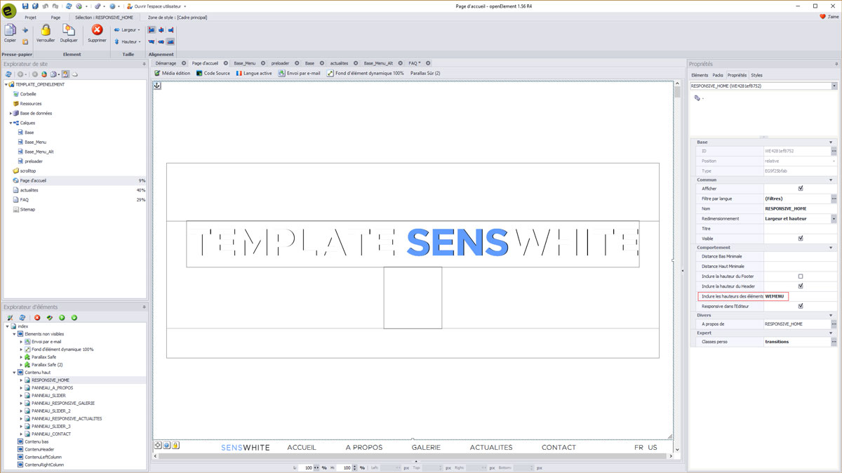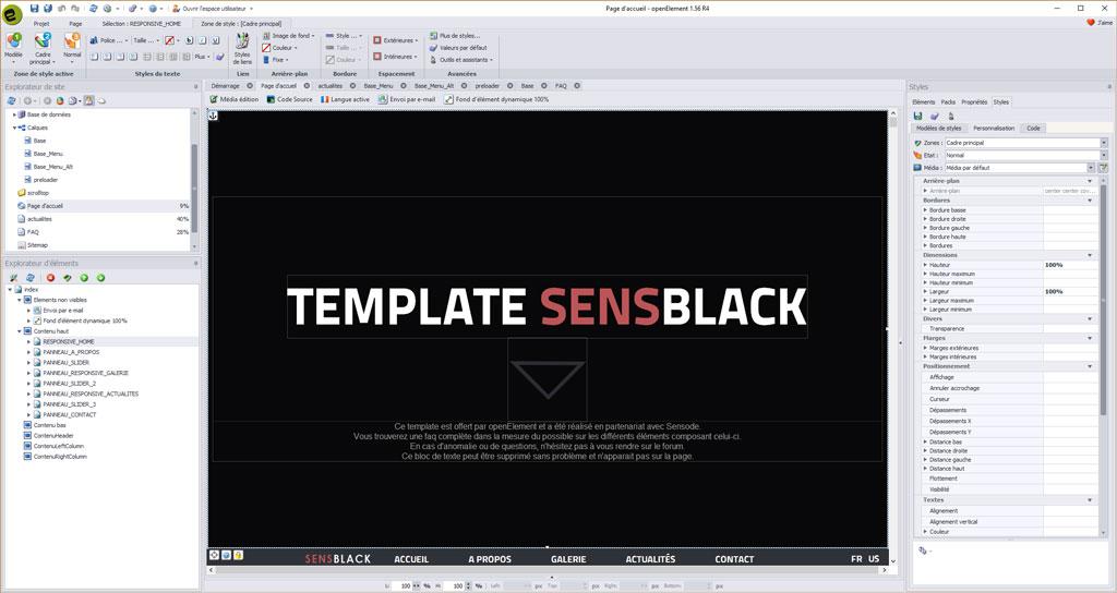 Comme vous pouvez le voir, le template SENSWHITE comporte de tous nouveaux éléments ainsi que du code spécialement développé et intégré au mieux dans Openelement.